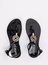 Tamanco em J-Lastic com bico quadrado. Possui uma tira larga no cabedal, que cobre o peito do pé. Tem salto bloco em formato de flor, o logo da Petite Jolie. Deixa dedos, laterais e calcanhar à mostra.
